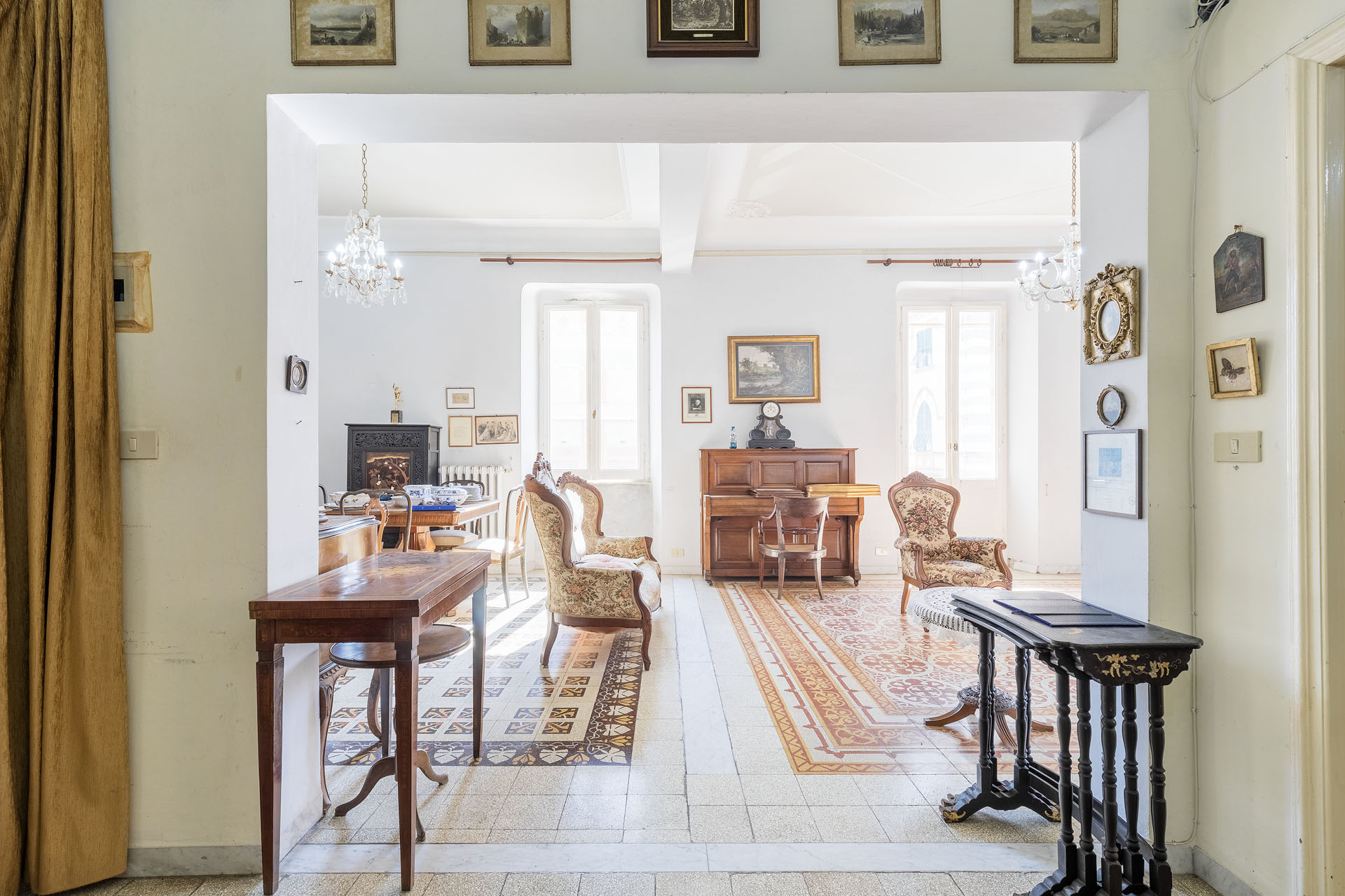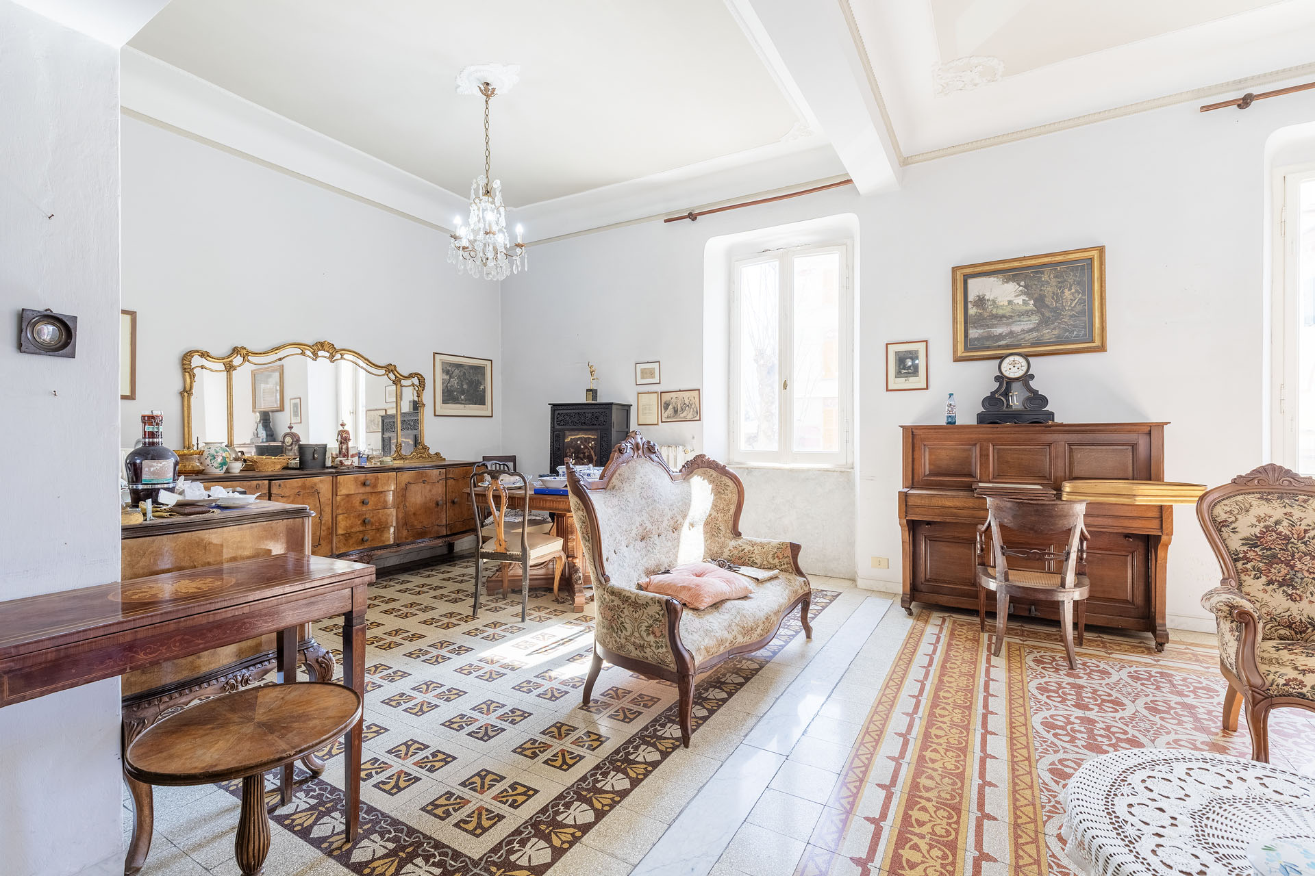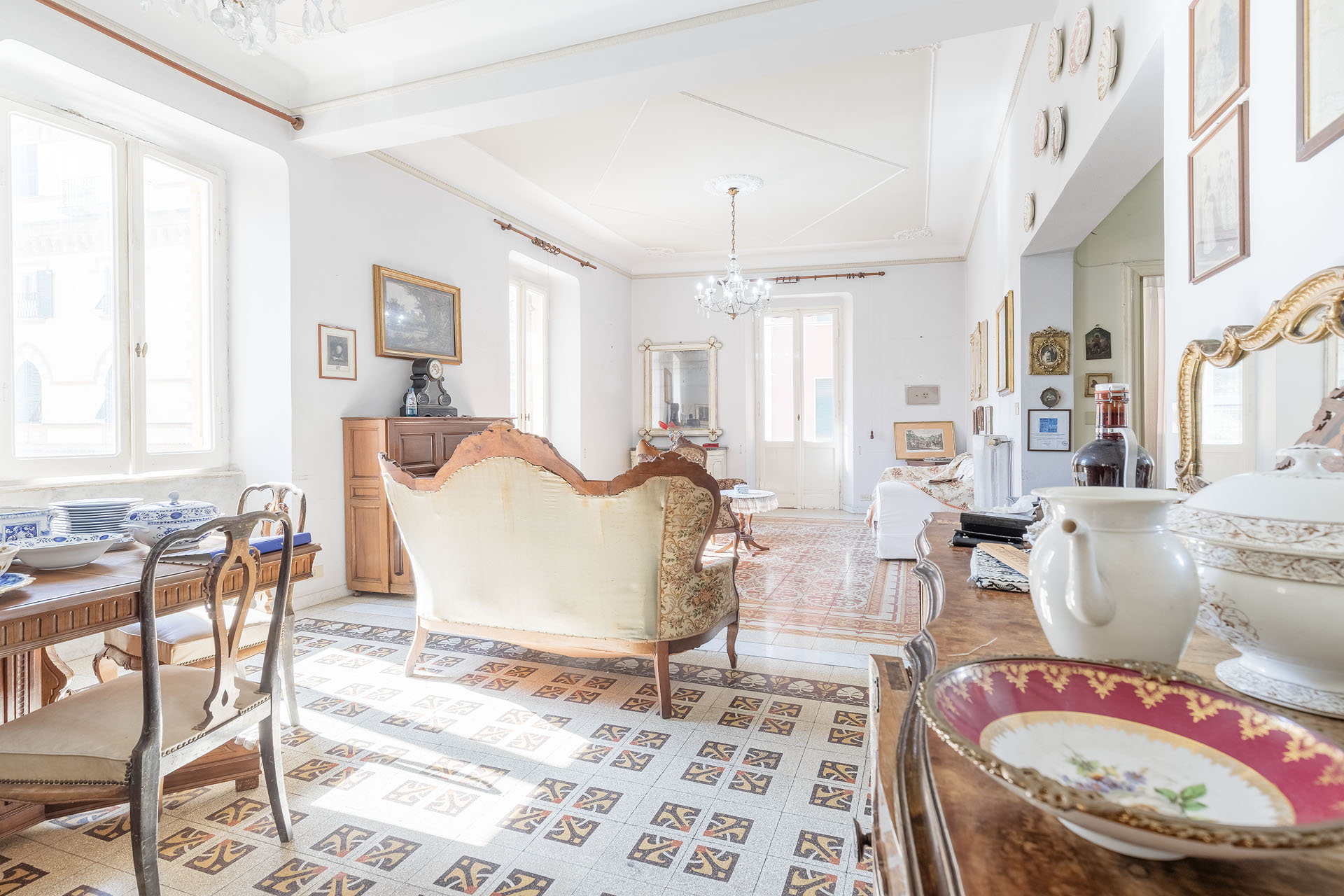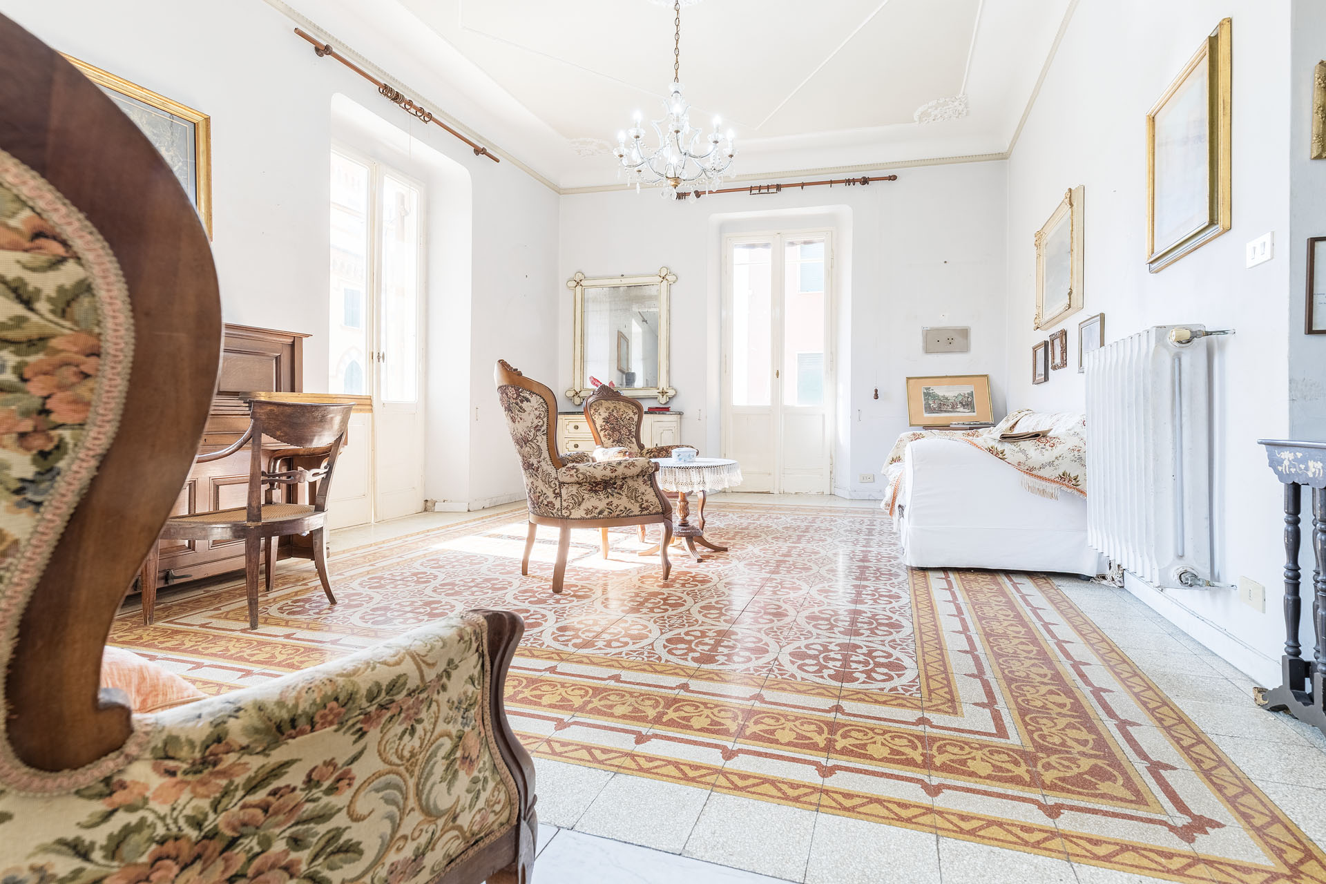 Ubicato al piano primo di un importante palazzo Levantese di Corso Roma servito da comodo ascensore di recente installazione e con una metratura commerciale che supera 140mq, ambienti interni organizzati come i classici appartamenti genovesi signorili dell’epoca e impreziositi dagli splendidi decori dei pavimenti originali che catturano lo sguardo fin dal primo momento, con una divisione che allo stato attuale vede: