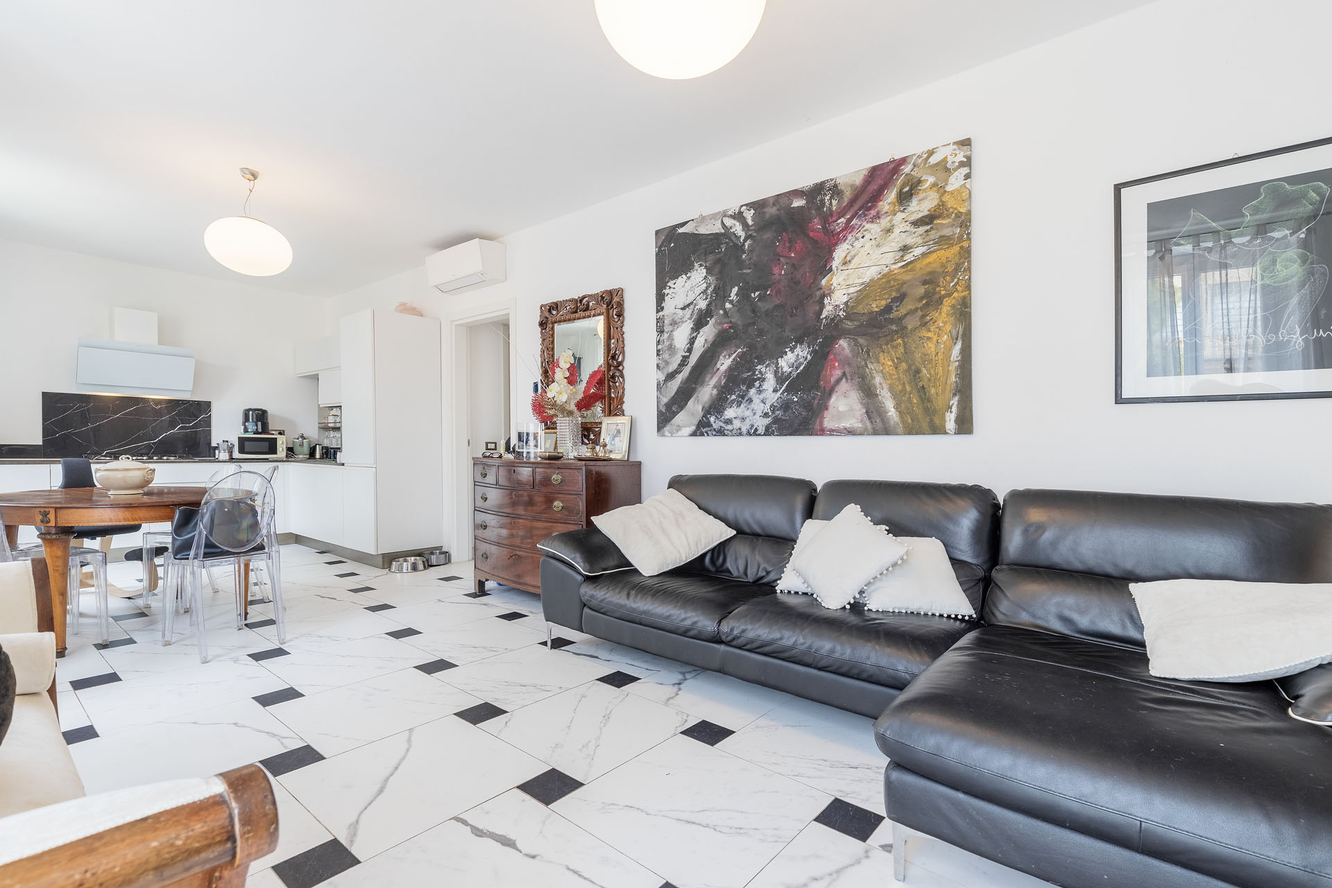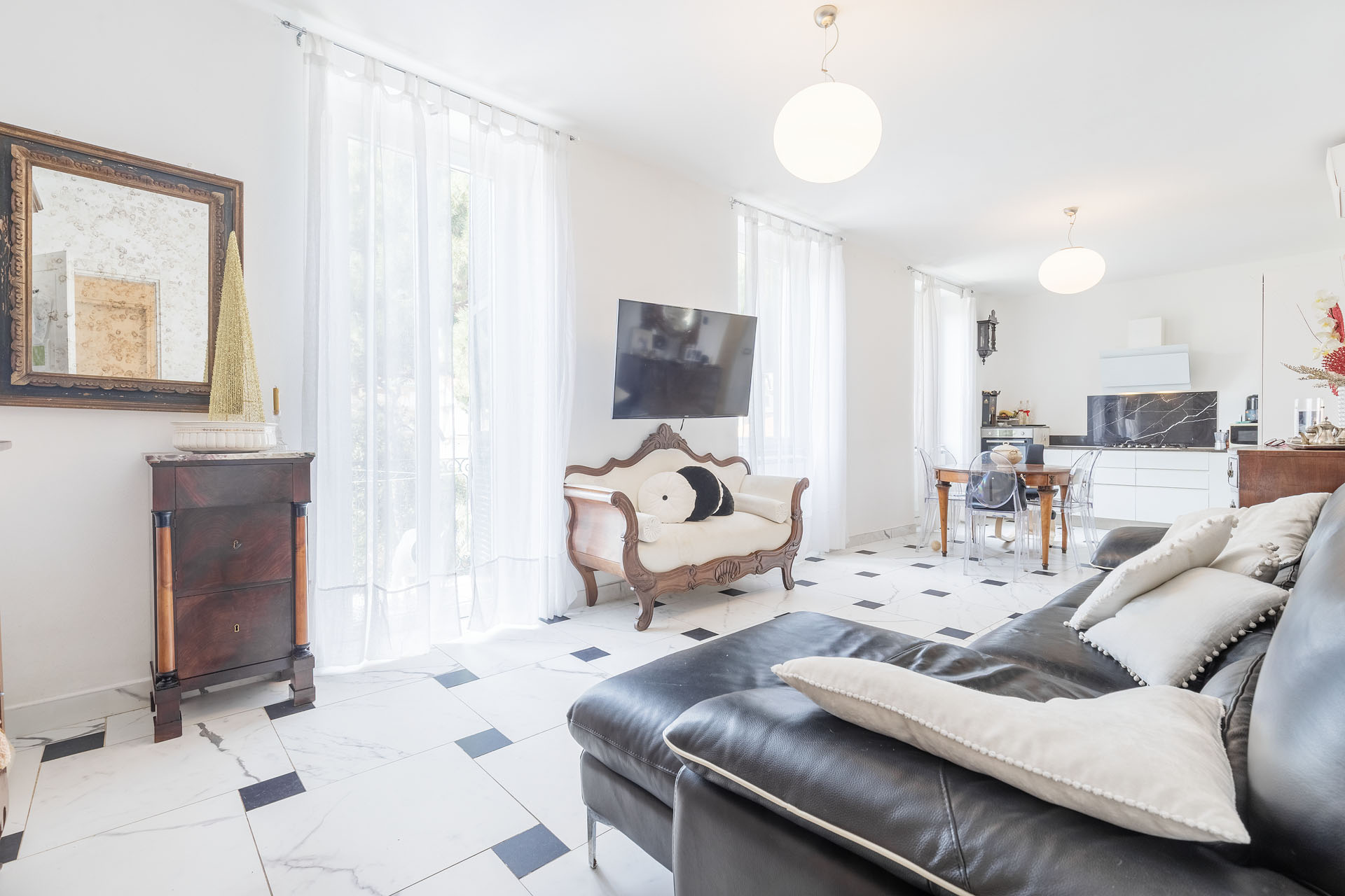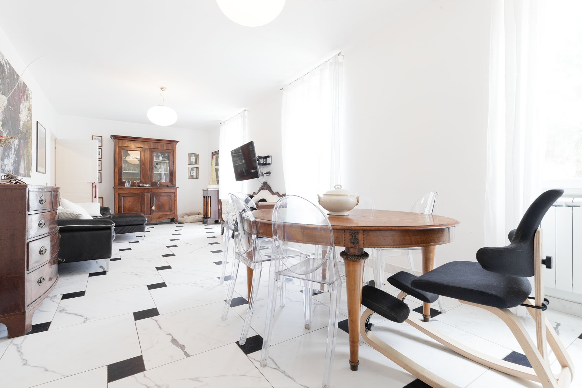 - salone in stile classico con cucina e illuminato da tre ampie finestre;