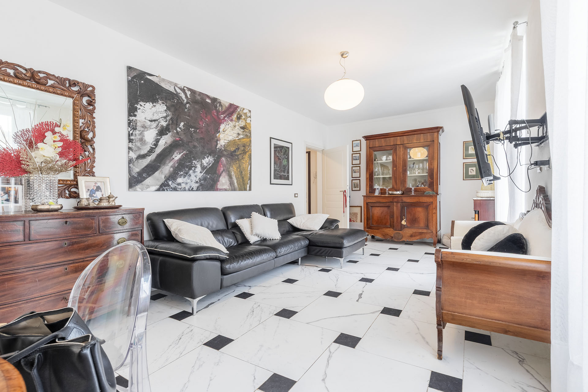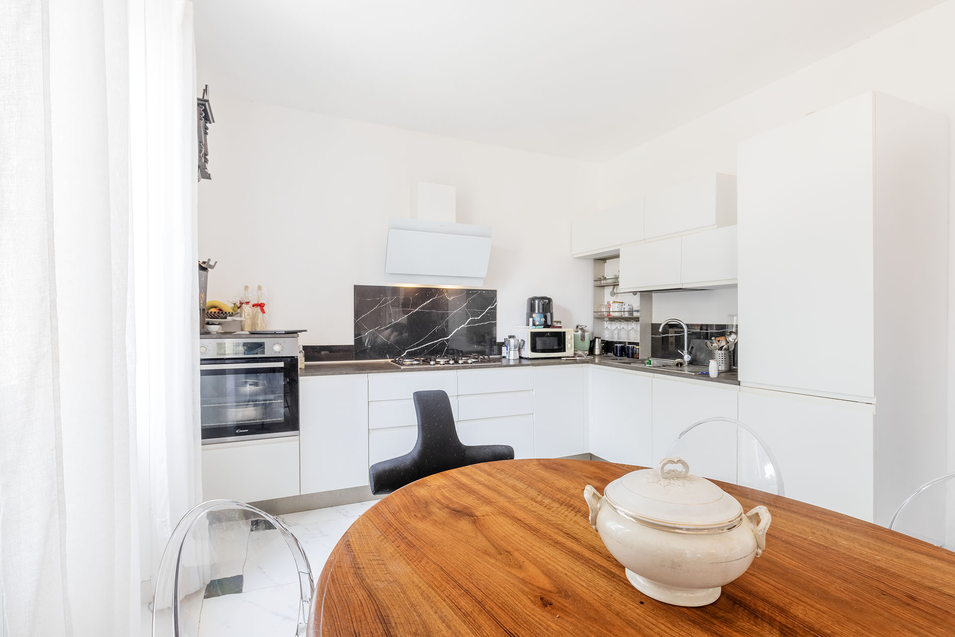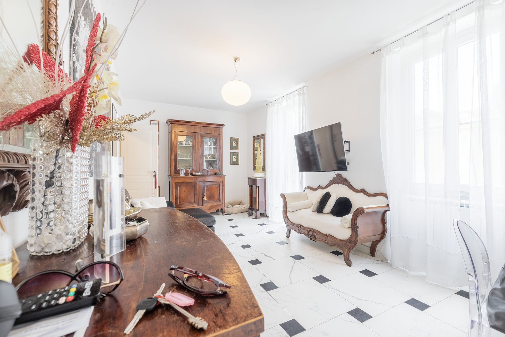 - salone in stile classico con cucina e illuminato da tre ampie finestre;