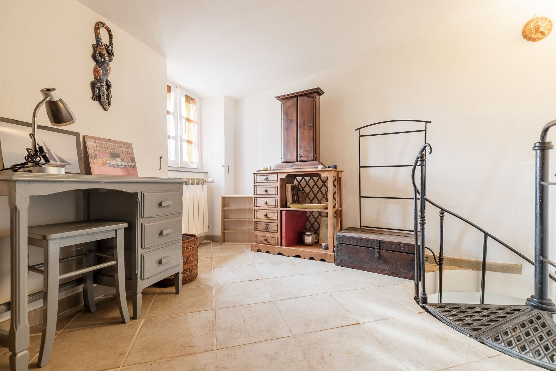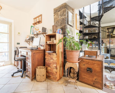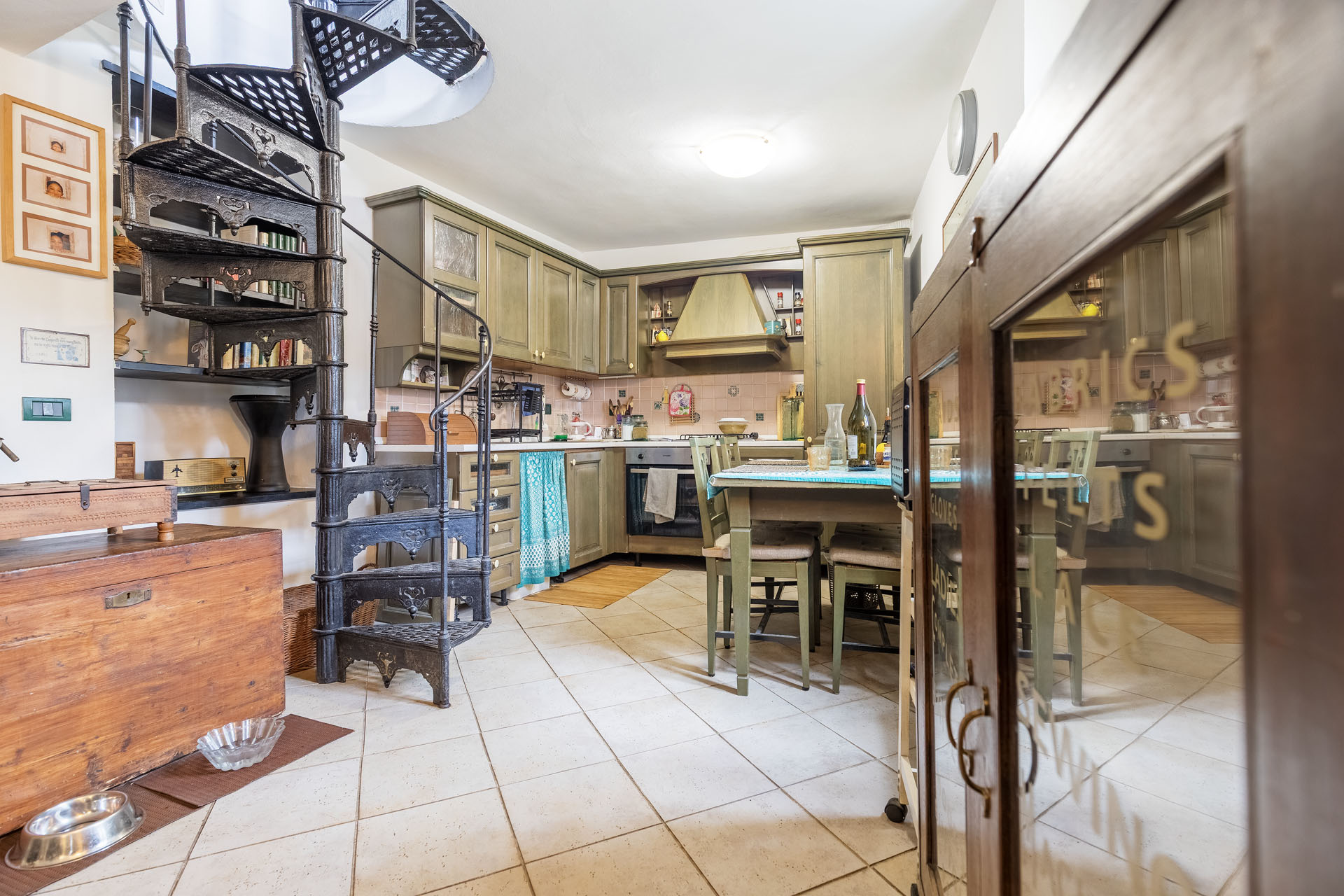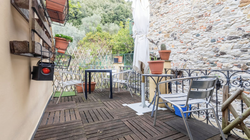 Mentre gli spazi esterni di proprietà sono la scalinata che conduce al balcone panoramico e una bella terrazza sul retro della casa, entrambi accessibili dal soggiorno.