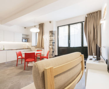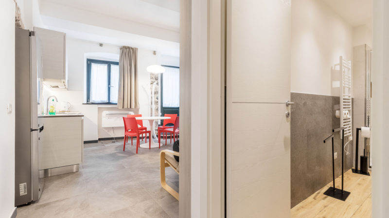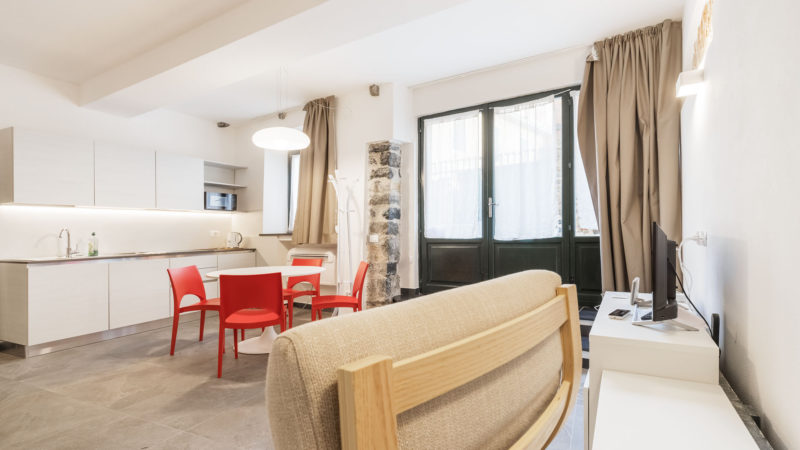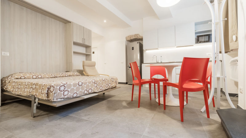 In questo meraviglioso contesto proponiamo l’acquisto di un appartamento di notevole pregio, organizzato ad “open space” e completamente ristrutturato in ogni sua parte, ben studiato in ogni particolare e sviluppato su un unico piano per una metratura commerciale di 46mq, dotato sia di un ingresso indipendente, sia di un ingresso dall’androne condominiale. Gli ambienti interni vedono un grande spazio living illuminato da un’ampia porta finestra a tre ante con l’angolo cottura ben inserito lungo la parete, un disimpegno che porta al comodo bagno e al retro dell’appartamento, dove sono ubicati sia l’ingresso condominiale sia una zona ripostiglio.