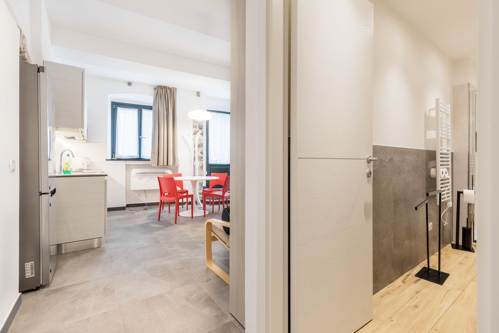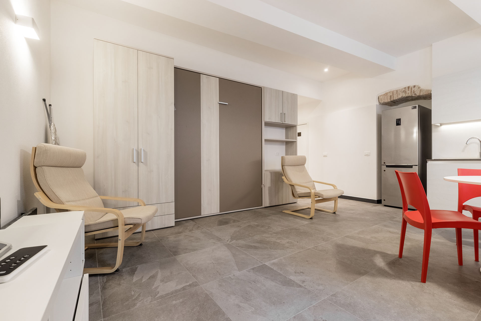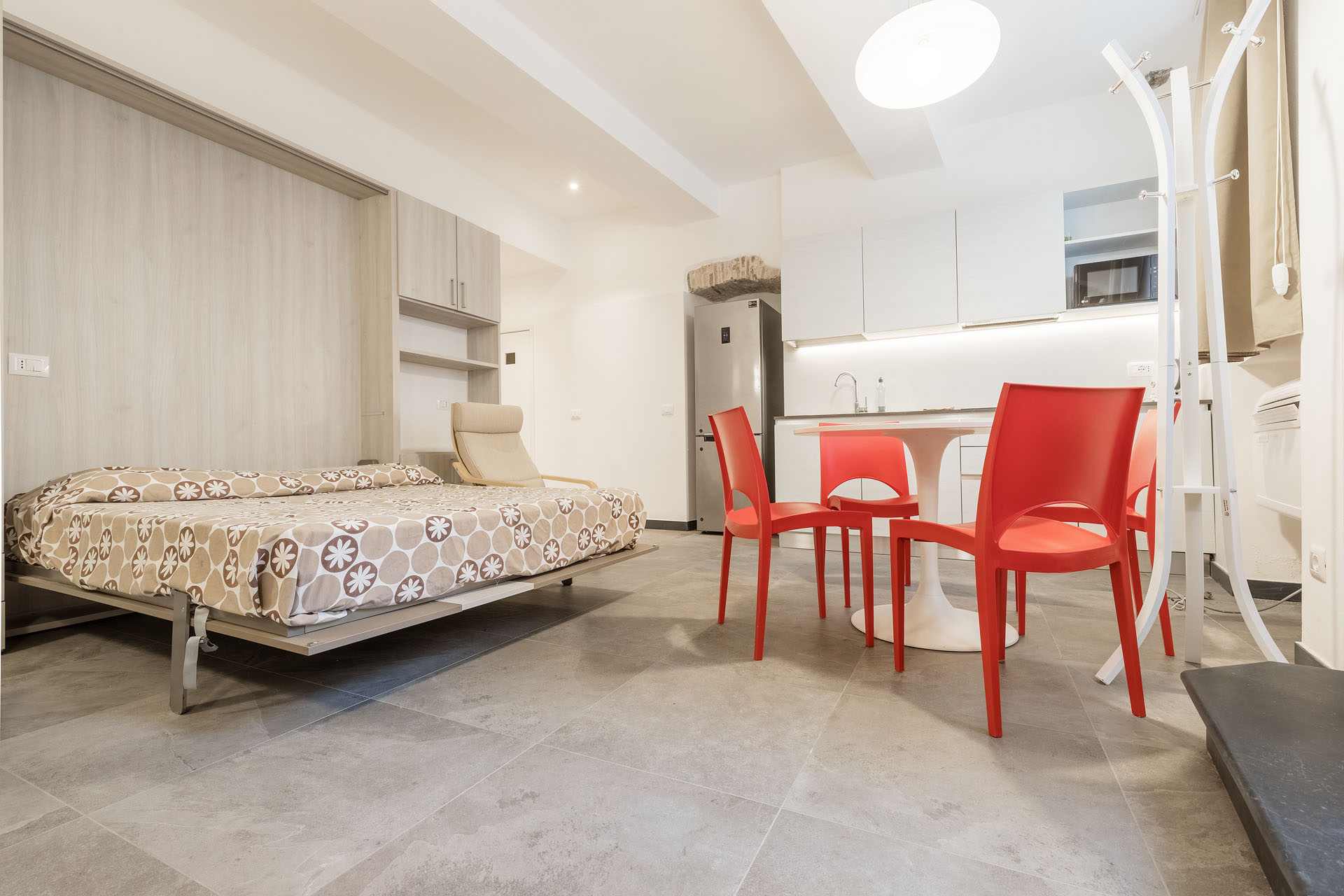 In questo meraviglioso contesto proponiamo l’acquisto di un appartamento di notevole pregio, organizzato ad “open space” e completamente ristrutturato in ogni sua parte, ben studiato in ogni particolare e sviluppato su un unico piano per una metratura commerciale di 46mq, dotato sia di un ingresso indipendente, sia di un ingresso dall’androne condominiale. Gli ambienti interni vedono un grande spazio living illuminato da un’ampia porta finestra a tre ante con l’angolo cottura ben inserito lungo la parete, un disimpegno che porta al comodo bagno e al retro dell’appartamento, dove sono ubicati sia l’ingresso condominiale sia una zona ripostiglio.