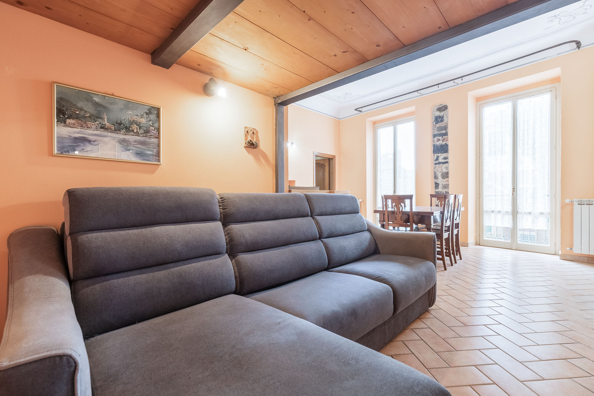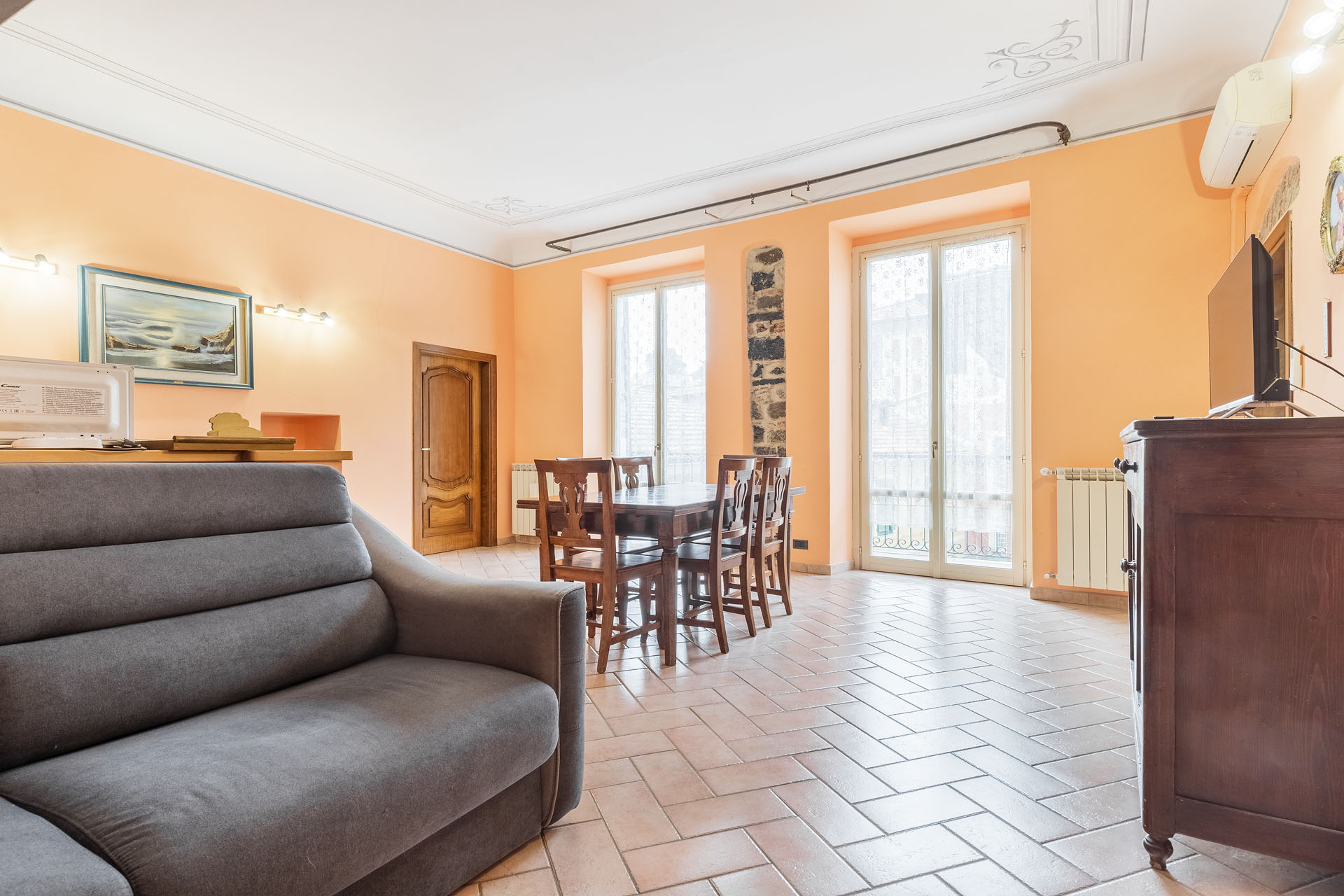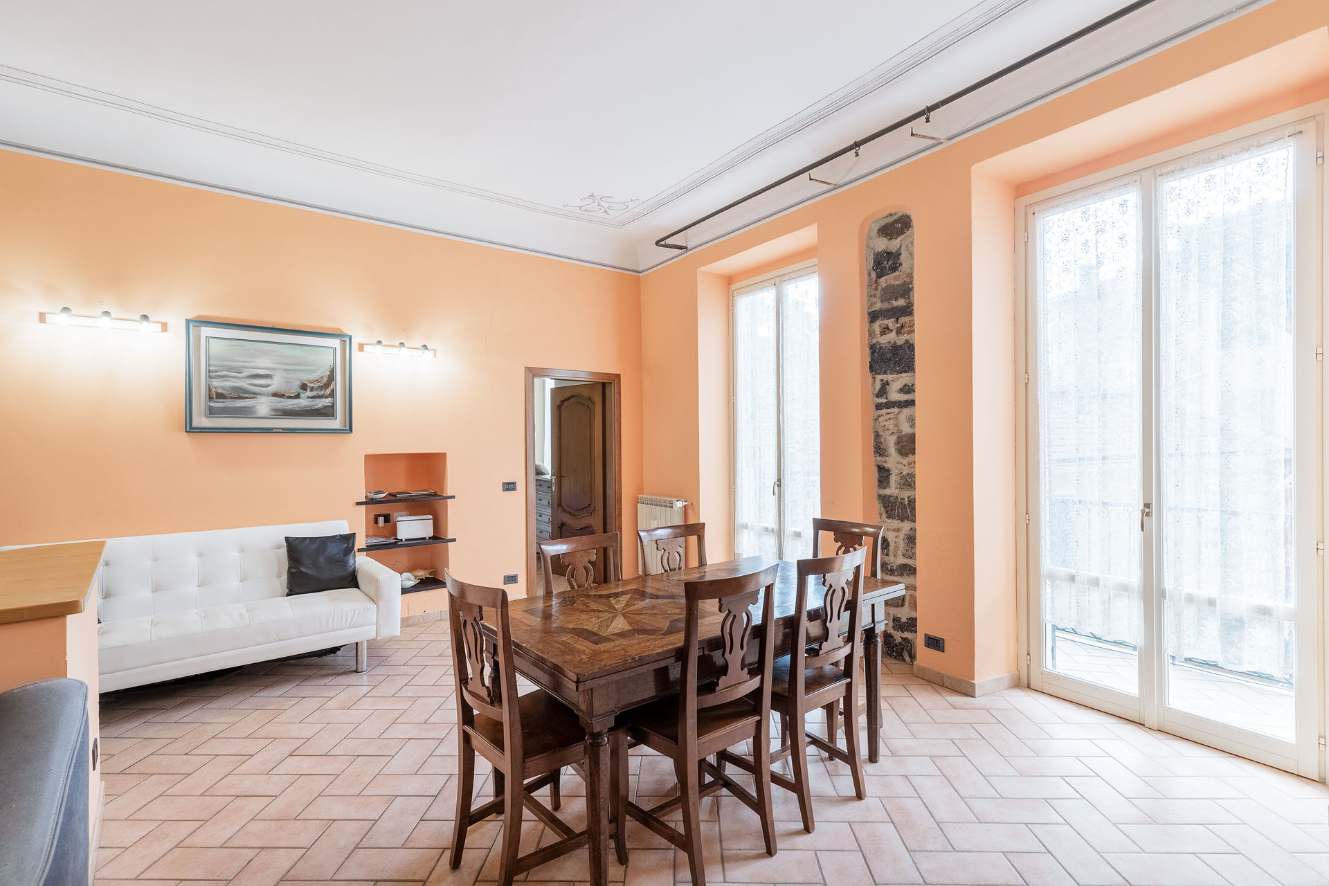 Il living ha due ampie porte finestre affacciate direttamente sul balcone di proprietà, uno dei pochi balconi della Levanto medioevale, che offre un’incantevole vista sui caratteristici caruggi e su importanti monumenti come Palazzo Restani e la chiesa di Sant’Andrea.
