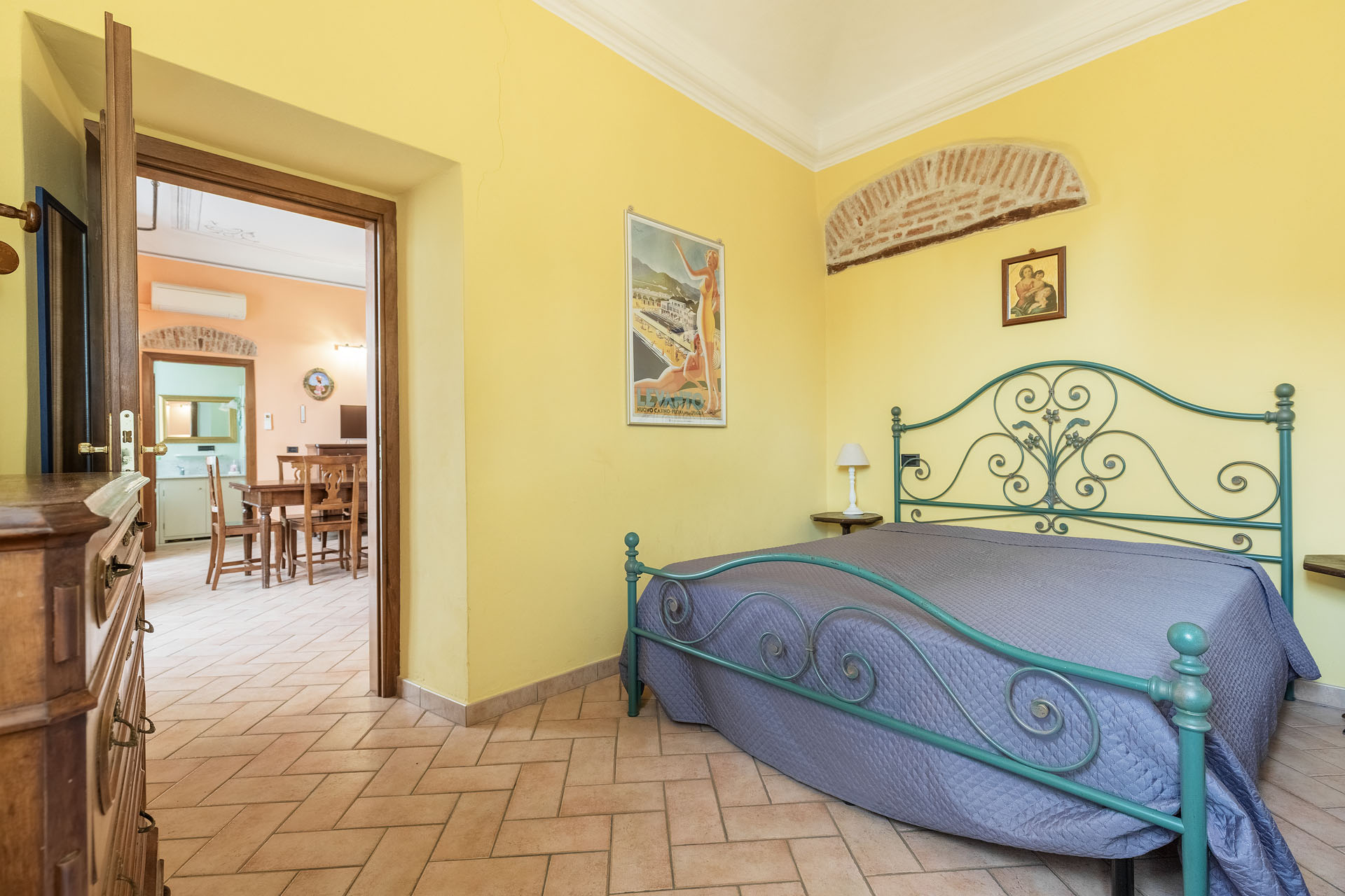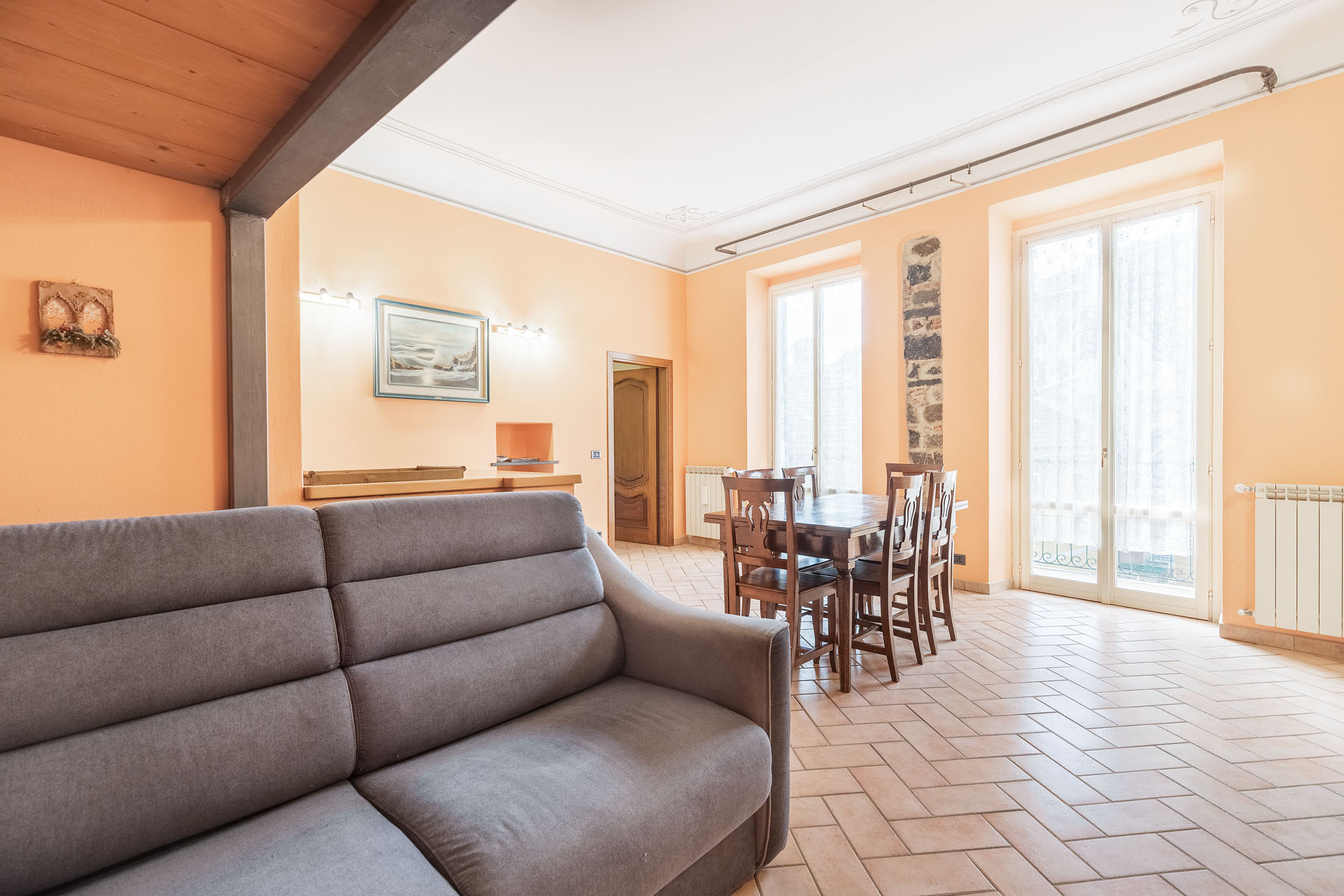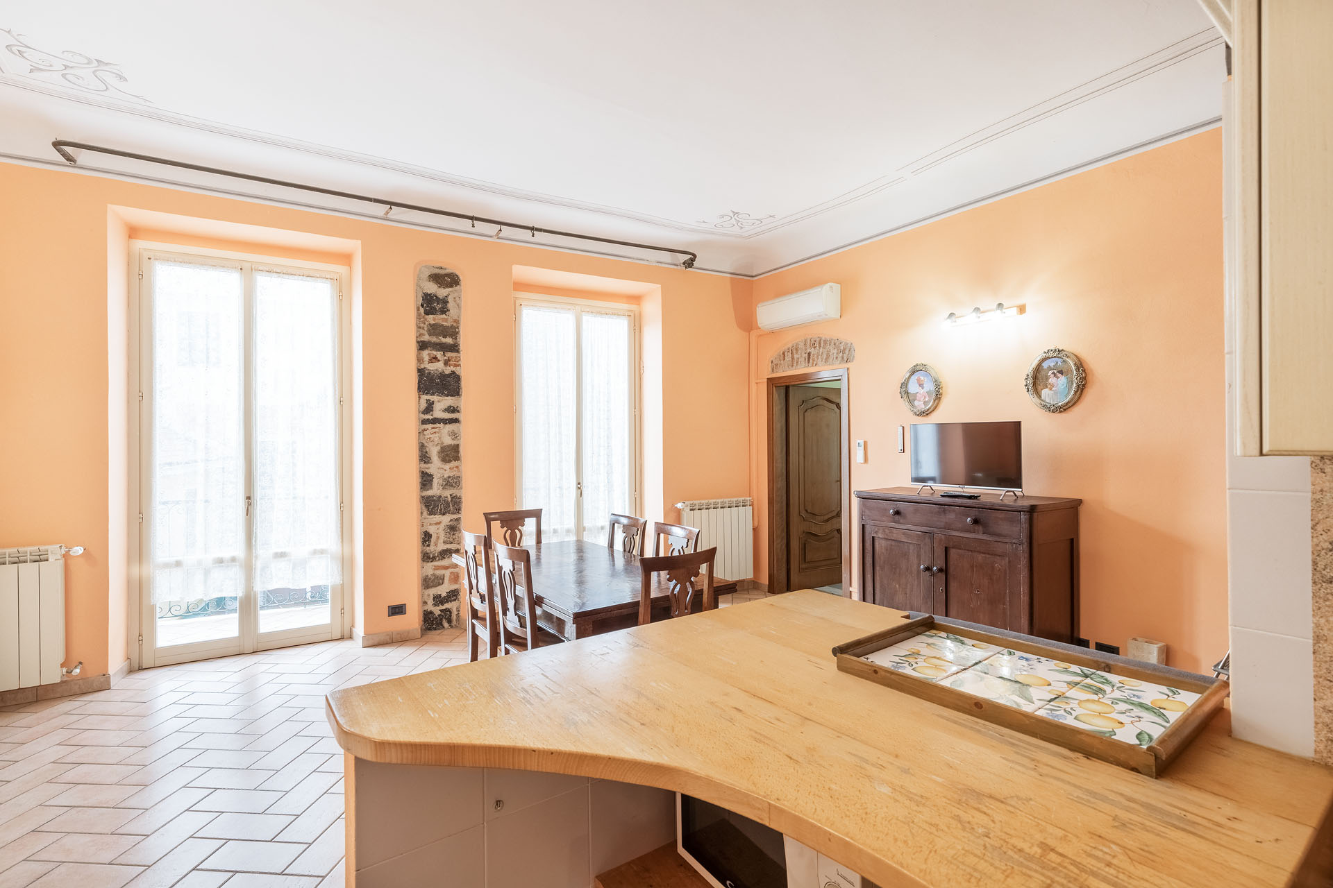 Il living ha due ampie porte finestre affacciate direttamente sul balcone di proprietà, uno dei pochi balconi della Levanto medioevale, che offre un’incantevole vista sui caratteristici caruggi e su importanti monumenti come Palazzo Restani e la chiesa di Sant’Andrea.