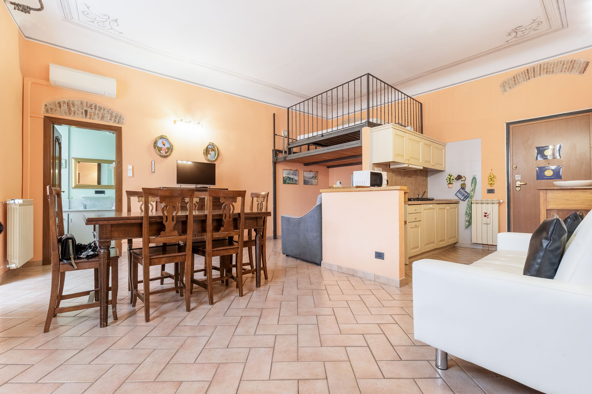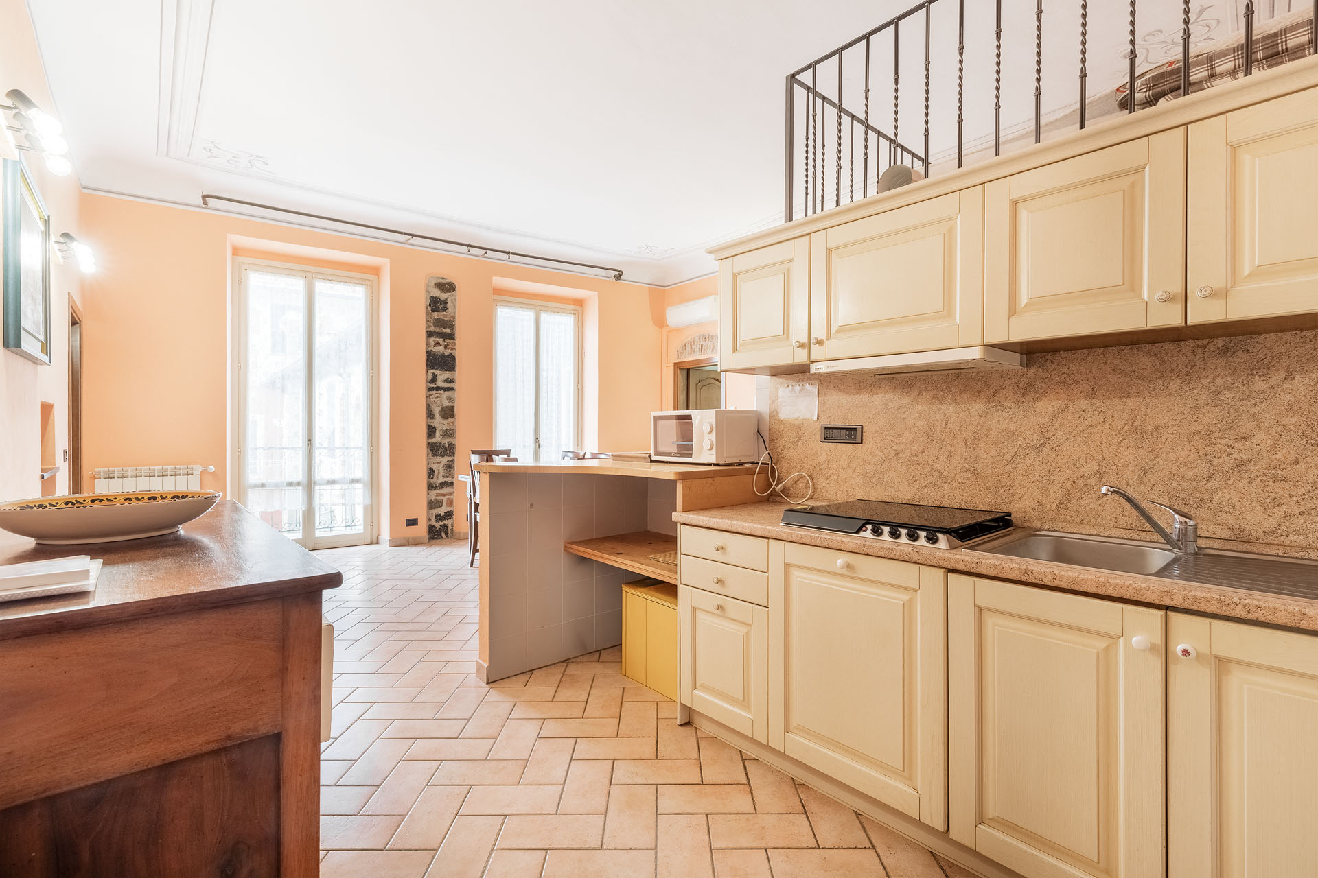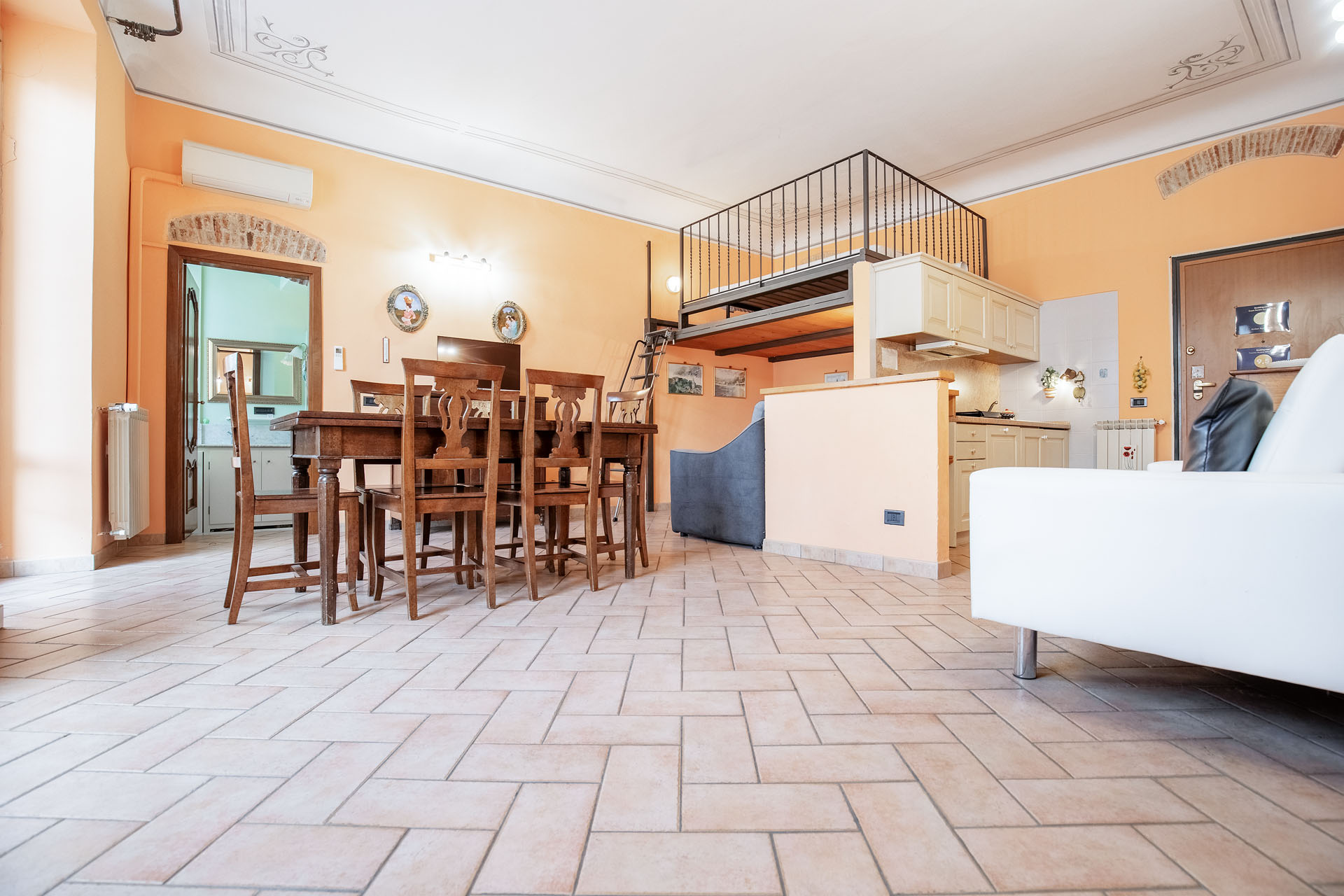 - l’ingresso sull’ampia zona living, dotata di angolo cottura e di un soppalco arredato come “zona notte supplementare”;